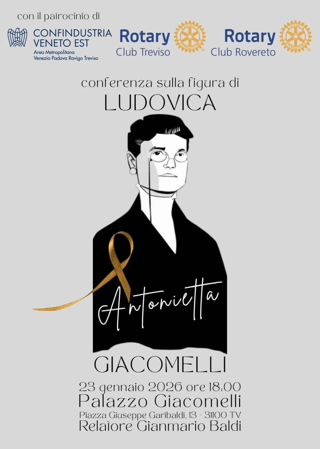 In una cornice storica intrisa di fascino, Palazzo Giacomelli a Treviso si prepara ad accogliere una serata speciale: i Rotary Club di Treviso e Rovereto, guidati dai loro Presidenti Simona Guardati e Alberto Gasperi, con il patrocinio di Confindustria Veneto Est- che si ringrazia per la disponibilità della bellissima struttura, celebrano la straordinaria storia di “Antonietta” Giacomelli (1857-1949).