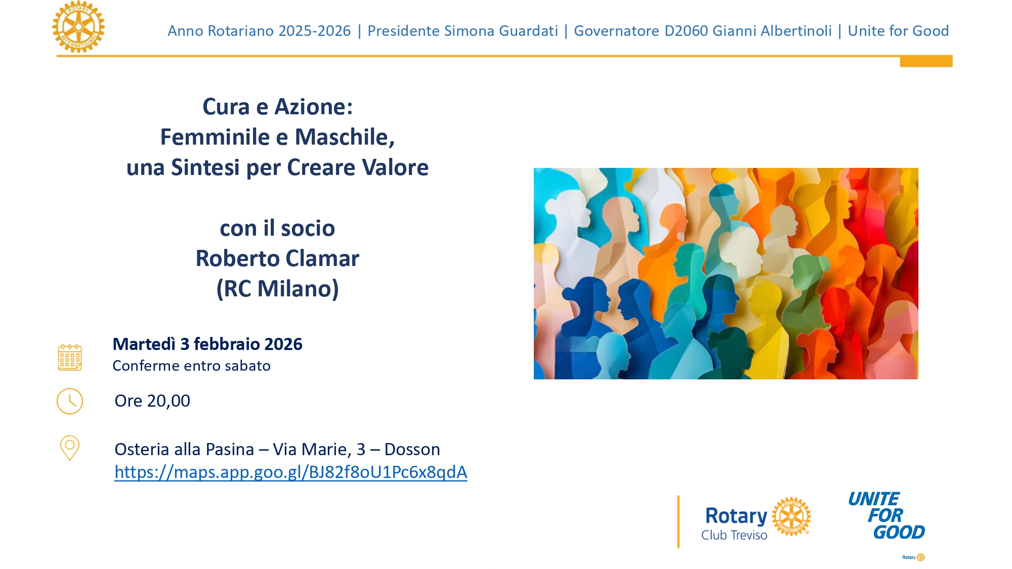 L’intervento, nella sua parte centrale, analizza il passaggio della cultura Rotariana dalla maschilità all’inclusione, e si ragiona sulla femminilizzazione dei contenuti e delle prassi.